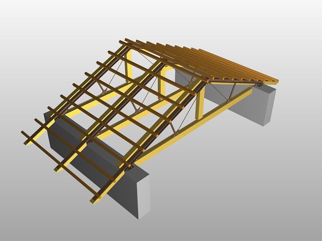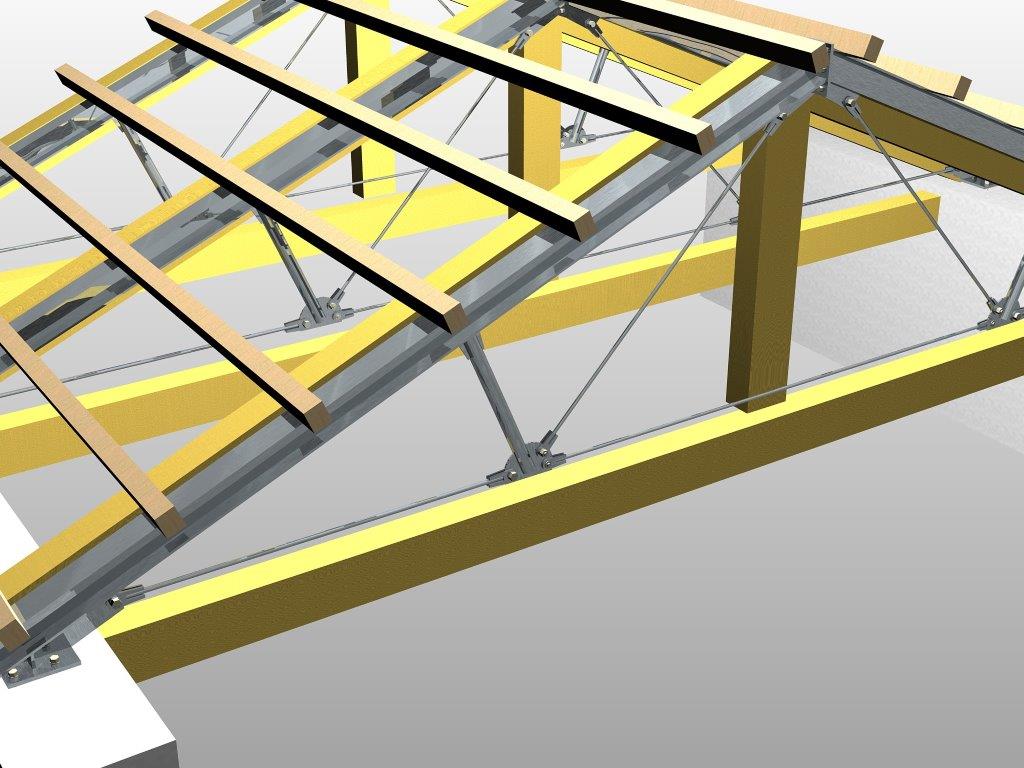 Il controvento orizzontale è fornito da tiranti disposti in falda tra le due capriate centrali, mentre i collegamento tra tutte le capriate è garantito dalle stesse terzere in legno opportunamente fissate con angolari in acciaio semplici e doppi