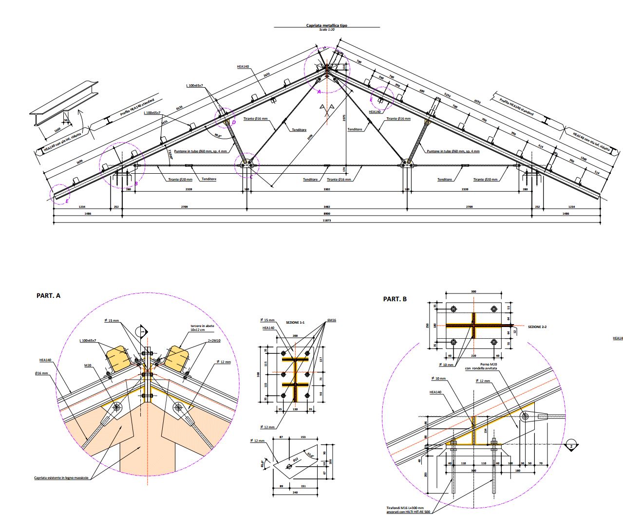 Alle capriate lignee sono affiancate nuove capriate in acciaio, composte da profilati in acciaio e cavi secondo lo schema "Polonceau", sulle quali saranno posizionate le nuove terzere in legno, la nuova listellatura e il manto in coppi recuperati dalla copertura. Le nuove capriate sono state posizionate con estradosso leggermente sopraelevato rispetto a quelle esistenti in modo da evitare il trasferimento su quest'ultime dei carichi verticali. Le capriate in legno sono inoltre collegate a quelle esistenti con staffe asolate in grado di fornire il solo vincolo orizzontale